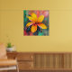 This vibrant abstract artwork captures the radiant beauty of a flower in full bloom, expressed through bold color, layered texture, and expressive movement. Golden yellow petals unfold from a warm coral and crimson center, radiating energy and warmth against a richly textured background of teal, green, blush, and muted earth tones. Dynamic splashes and painterly details give the piece a lively, spontaneous feel, as if the flower is bursting with life and light. The composition blends botanical inspiration with contemporary abstraction, striking a balance between recognizable form and artistic freedom. Thick brushstrokes, subtle drips, and layered surfaces add depth and character, making the artwork feel tactile and emotionally engaging. The contrast between warm and cool colors creates visual harmony while keeping the design bold and uplifting.