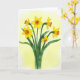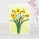 This greeting card features a cluster of six golden, trumpet-shaped blossoms rising from the lower edge, their slender green stems guiding the eye upward like a gentle reach toward someone you care about 🌷. Some flowers face forward while others tilt slightly, as if leaning in close together the way good friends do. A soft yellow wash fills the background, giving the scene a spring-morning glow that feels light and airy. Each bloom shows bright yellow petals opening around a ruffled orange center, and the contrast pulls your gaze into the flower’s warm middle. Deep green stems and broad leaves add structure, with defined edges that stand out against the watery paint. The main greeting appears near the top in a simple, medium-sized font, colored in a warm orange that echoes the flower centers, with a smaller line of text near the bottom in muted green. 🐰 The orange coronas look lightly textured, with frilled edges and tiny darker touches that make them stand out against the pale yellow background.