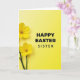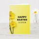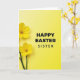 This card features a bright, sunny yellow background that fills the whole front, giving the scene a fresh spring feel 🌷. Along the left edge, two tall flowers rise upward on slim green stems, their round golden petals opening like small sunbursts. The tiny dotted centers add texture, and the pair leans in the same direction as if keeping close company, like sisters walking side by side. On the right half, large dark letters read “HAPPY EASTER,” set high and easy to spot against the yellow field. Beneath that, the word “SISTER” appears in the same dark color, placed lower and spaced so it feels like a direct, affectionate address. The layout stays simple with lots of open space, letting the flowers and the message share the attention without crowding. The lighting looks even and soft, keeping the yellow smooth and the flower details crisp 🐰. Two golden blossoms climb the left margin while the dark text sits on the right, balanced across the wide yellow backdrop.
