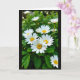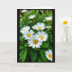 Designed with a vertical, close-up view of nature, this card centers on a cluster of white daisy-like flowers with sunny yellow centers, set against a softly blurred green background. The blossoms stretch across the frame like a small bouquet leaning in together, giving the scene a gentle, friendly closeness ❤️. Soft daylight falls from above, brightening the petals and warming the golden centers while leaving the distant foliage hazy and calm. A short greeting sits near the top in a light, airy color, with a smaller line placed near the bottom in a matching tone so it doesn’t compete with the flowers. The crisp foreground details show fine petal textures and slightly crinkled green leaves beneath, adding a grounded, natural feel 🌼. Some outer petals carry a faint reddish blush at the tips, like a shy flush that adds quiet romance to the otherwise simple palette. The background fades into smooth emerald greens with indistinct leaves and a few out-of-focus blooms behind the main cluster.