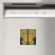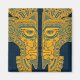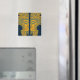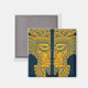 A pair of Aztec inspired masks are face at each other creating the appearance of a third mask looking forward. The intricate lines and circles are painted a golden yellow color that is highlighted to produce a subtle shine on the surface. The interior and background of the image is finished with deep blue shades that run down the middle of the design in between the two masks. The tight cropping of the image creates an aggressive pattern that really stands out on this magnet. This stylish Aztec design has the look of being an ancient artefact with a modern feel.