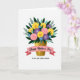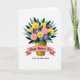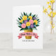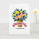 This greeting card features a digital illustration of a full floral bouquet rising from a glowing golden pot on a white background, with a romantic, tender mood suggested by the way the blooms lean together like close friends ❤️. Sunny yellow flowers with warm orange centers sit beside softly curled pink roses, while small purple and blue clusters fill in the gaps like quiet whispers between petals. Layers of green foliage—some broad and deep emerald, others light and feathery—add depth and a gentle, embracing feel around the arrangement. A curved pink ribbon banner drapes across the front of the pot, carrying the main message in dark lettering that stands out clearly against the ribbon. Beneath the pot, a second line of text appears in smaller type, centered and spaced to feel calm and balanced 🌼. The golden pot has a subtle shine, with soft highlights along its rim and sides that make it look slightly luminous. The bouquet’s colors stay crisp against the white space, and the pink ribbon arcs neatly across the pot with its ends curling outward.
