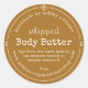 Golden Brown Script Handmade Body Butter Label round sticker featuring a warm golden brown background with white script and serif typography. The design clearly presents your business name, product title, ingredients, and weight in a clean, easy-to-read format that feels both handmade and professional. Ideal for organic skincare jars, whipped body butter packaging, fall collections, gift sets, and small business branding. Easily personalize with your details.