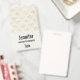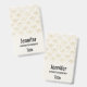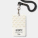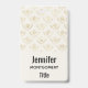 A name tag with an elegant pattern with gold colored bumble bees in a repeating pattern on a cream colored background.