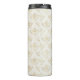Water bottle with an elegant pattern with gold colored bumble bees in a repeating pattern on a cream colored background.