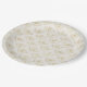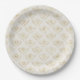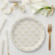Paper plates with an elegant pattern with gold colored bumble bees in a repeating pattern on a cream colored background.