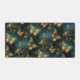 An elegant desk mat with a butterflies pattern in glittering golden hues and glowing blues.