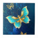 Flying gold, jewelry butterfly on blue textural background. Design with butterflies.