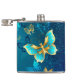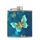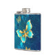 Flying gold, jewelry butterfly on blue textural background. Design with butterflies.