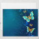 Flying gold, jewelry butterfly on blue textural background. Design with butterflies.