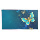 Flying gold, jewelry butterfly on blue textural background. Design with butterflies.