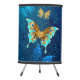 Flying gold, jewelry butterfly on blue textural background. Design with butterflies.