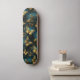 An elegant skateboard with a butterflies pattern in glittering golden hues and glowing blues.