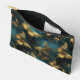 An elegant small accessory pouch with a butterflies pattern in glittering golden hues and glowing blues.