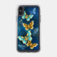 Composition of flying, jewelry, gold and dark butterflies on textured jewelry background. Golden butterfly.