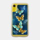 Composition of flying, jewelry, gold and dark butterflies on textured jewelry background. Golden butterfly.