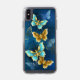 Composition of flying, jewelry, gold and dark butterflies on textured jewelry background. Golden butterfly.