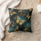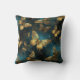 An elegant throw pillow with a butterflies pattern in glittering golden hues and glowing blues.