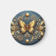 An artistic depiction of an ornate golden butterfly surrounded by elegant floral and ornamental curls on a contrasting blue background, enhancing themes of luxury, elegance, and decor.