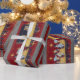 The old-fashioned Gold Christmas Train with Burgundy and gray stripes