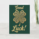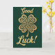 This design shows a deep emerald green background with a large golden four-leaf clover centered like a shared token of good fortune ☘️. Inside each leaf, Celtic knot patterns loop and braid together, giving the clover a rich, heirloom look that feels like something two close friends might admire side by side. The word “Good” sits above the clover in gold lettering, and “Luck!” appears below it in matching gold, both slightly slanted and glossy. The letters carry a soft shadow that makes them look gently raised from the green field, adding a touch of depth without clutter. Warm gold against cool green creates a cozy, celebratory contrast, as if the card is dressed up for St. Patrick’s Day 💚. Fine highlights along the clover’s edges make it gleam like polished metal, drawing your eye back to the center. The knotwork lines stay crisp within each leaf, and the gold text frames the clover neatly from top to bottom.