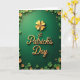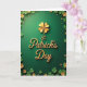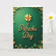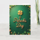 This St. Patrick's Day card features a deep emerald green background with “St. Patrick’s Day” centered in shiny gold lettering, giving the words a raised, glowing look. Just above the phrase sits a gold four-leaf clover, like a small charm catching the light, and it draws the eye in with a gentle, welcoming glow 💚. Around the edges, clusters of shamrocks and extra four-leaf clovers tumble in a loose frame, mixing rich green leaves with a few matching gold ones for contrast ☘️. Tiny gold starburst accents are sprinkled between the leaves, adding little points of sparkle that feel like shared glances at a party. Soft lighting and faint shadows make each leaf and letter stand out from the background, adding depth without looking busy. The gold text stays in the middle while the leafy border keeps to the perimeter, creating a cozy, gathered-around feeling like friends leaning in close. The matte green field stays smooth behind it all, while the metallic clovers and starbursts gleam along the border and above the centered greeting.