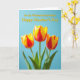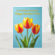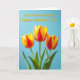 Designed with three flowering bulbs rising in a tall vertical layout, this card places a striped central bloom in the spotlight against a soft sky-blue background. The main flower mixes golden-yellow petals with deep red streaks, and it seems to lean forward a touch, like it’s reaching out with quiet affection ❤️. Two slightly softer blooms sit to either side, mirroring each other and creating a gentle, companionable balance. A cluster of broad emerald-green leaves spreads across the lower portion, their smooth surfaces catching light in a way that feels calm and tender. Near the top, a short message appears in raised golden lettering, centered and spaced so it feels like it’s floating above the flowers 🌼. The text stands out clearly against the blue, with the warm gold echoing the yellow tones in the petals. The background stays open and uncluttered, and the three blossoms are framed by green leaves at the bottom with the gold message hovering above.