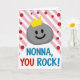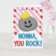 This design shows a rounded gray rock character wearing a sharp, golden crown, centered like a little royal friend with a sweet, welcoming grin ❤️. Its face is kept simple with two black oval eyes and a curved smile that feels like it’s beaming at someone just off to the side. Behind it, diagonal pink and white stripes set a lively stage, while scattered red dots float across the upper area like confetti. The crown’s pointed angles stand out against the smooth pebble shape, adding a gentle sense of admiration, like a proud nod between close family. Near the bottom, the text is stacked and easy to spot, with “NONNA,” in large blue letters above “YOU ROCK!” where “YOU” is red-orange and “ROCK!” returns to blue 🌼. The thick lettering anchors the layout and balances the busier pattern above. The top half is filled with stripes and dots, while the lower half is mostly open so the words read clearly against the light background. Red polka dots of slightly different sizes are sprinkled across the striped area above the crowned rock.
