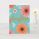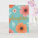 The front design shows a glittery gold word “daughter” placed in the center, drawing the eye like a bright note of affection ❤️. An aqua background sets a calm, open space, while warm coral and soft salmon flowers gather around the lettering as if leaning in close. Each large bloom has petals that radiate outward from deep, inky blue centers, giving the arrangement a gentle, intimate focus. Inside those dark centers, thin white swirls curl like tiny flourishes, adding a tender, romantic touch without needing extra imagery. Smaller blush-pink flowers and pale white leaf sprigs are scattered between the larger shapes, creating the feel of a thoughtful bouquet shared between friends or family 🌼. The central word uses thick, rounded lettering with a sparkly texture, and it sits slightly above the midpoint, framed by the surrounding botanicals. The coral blossoms cluster along the sides and corners, with the white sprigs floating near the edges against the cool aqua field.