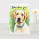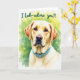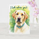 This greeting card features a golden-furred dog centered in the frame, head and chest forward against a softly blurred green-yellow background that feels like a sunlit garden. The dog’s dark, thoughtful eyes and relaxed mouth create a tender, loyal look, like it’s gazing at someone it trusts ❤️. Its thick, creamy coat is detailed and soft-looking, inviting the kind of gentle closeness shared between best friends. A turquoise collar with a small buckle adds a crisp pop of color and a modern touch against the warm fur tones. At the top, the phrase “I Lab- adore you!!” is written in a casual, flowing style, set in a dark ink that stands out clearly. The background has a light, watercolor-like haze with round bokeh spots that suggest filtered sunlight through leaves 🌼. Subtle golden highlights along the ears and chest catch the light, while the green-yellow backdrop fades smoothly toward the edges.