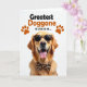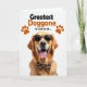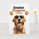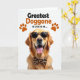 This card features a golden-furred dog centered on a bright white background, looking straight ahead with an open-mouthed grin and tongue out, like it’s greeting a close friend ❤️. The dog wears animal-print sunglasses and a matching bow tie, adding a fun, dressed-up touch that feels affectionate without trying too hard. Soft, high-key lighting brings out the warm amber tones and glossy texture of the fur while the dark lenses stand out in contrast. Above the portrait, a short message sits near the top in thick, dark lettering that’s easy to read at a glance. Two small orange paw prints flank the text, like little signatures of devotion. The overall layout keeps lots of white space around the face, making the dog’s happy expression feel even more inviting 🌼. The sunglasses show a subtle patterned frame, and the bow tie sits neatly under the chin with its folds clearly defined.