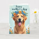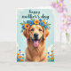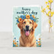 This design shows a golden-coated dog centered on the front, with a friendly face and an easy, open-mouthed smile that shows a pink tongue ❤️. Its direct gaze feels like a warm hello, as if it’s sharing a quiet moment of companionship with whoever holds the card. A flower wreath rests across its head, mixing bright blue and sunny orange-yellow blossoms with small green leaves for a fresh, garden look 🌼. The fur is illustrated with fine strokes and soft shading, giving the coat a plush, touchable texture. Behind the dog, a pale sky-blue background is lightly brushed with faint cloud shapes that keep the scene airy. Near the top, a flowing message sits prominently in a darker blue tone, standing out clearly against the light background. Along the lower edge, small sprigs of blue and orange wildflowers gently frame the portrait with a few green stems and leaves.
