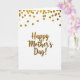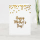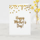 This greeting card features a simple white background with a warm, celebratory look that feels like a gentle hug ❤️. Centered on the front is the message “Happy Mother’s Day!” in a rich gold color, sized large enough to catch the eye right away. The lettering has smooth, flowing strokes that give the words a soft, affectionate tone without needing any extra imagery. Above the text, small round gold dots seem to drift downward like confetti, adding a light, friendly sparkle to the open space. The dots vary slightly in size and texture, creating the impression of a shiny, foil-like finish that catches light as you look across the card. With so much white space around the gold details, the design feels airy and calm, like a quiet moment shared with someone you care about 🌼. The gold message sits in the middle while the scattered dots cluster more toward the top, leaving the lower area mostly clear and bright. The upper portion shows a loose shower of golden circles fading as they fall across the white background.
