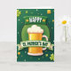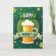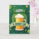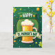 This greeting card features a golden beer mug centered inside a light green circle, topped with a thick white foam cap that looks ready to spill over. Around the circle, a ring of tiny gold dots adds a jewelry-like trim, giving the design a cozy, celebratory focus. The background shifts through emerald and lime greens in a smooth gradient, with scattered clovers, shamrocks, and small white-and-green dots that float like confetti, setting a friendly, together-at-the-pub mood 💚. Two curved green ribbons sweep across the scene, as if wrapping the mug in a cheerful embrace, hinting at a toast shared between close friends. On the upper ribbon, the word “HAPPY” sits in crisp white letters, and it stands out clearly against the darker green band. The lower ribbon carries “ST. PATRICK’S DAY” in matching white text, with small gold star and shamrock accents tucked near the ends ☘️. Golden clovers and bright yellow highlights pop against the greens, while the mug’s amber glow and snowy foam remain the main eye-catcher in the center.