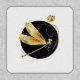 Artistically painted, gold, jewelry, sparkling dragonfly with detailed, filigree wings on golden wild flower, against black textured circle. Golden dragonfly.