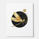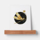 Artistically painted, gold, jewelry, sparkling dragonfly with detailed, filigree wings on golden wild flower, against black textured circle. Golden dragonfly.