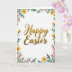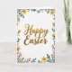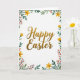 Designed with lustrous golden lettering, the words “Happy Easter” sit right in the vertical center, giving the page a gentle, affectionate focus like a note meant for someone close. A white background leaves plenty of open space, while a floral border wraps around the edges as if it’s quietly enclosing the message in a friendly embrace 🌷. Along the border, bright yellow five-petaled blossoms with small orange centers mingle with thin branches and fresh green leaves, suggesting an easy springtime closeness. Small round coral-red berries appear in clusters, adding a cozy, companionable contrast that feels like shared laughter in a garden. Tiny sky-blue accents pop up here and there, like little glances exchanged that make the scene feel warm without needing extra words 🐰. The text is smooth and flowing, with the gold color standing out clearly against the white, while the botanical elements stay mostly around the perimeter to keep the center open. Yellow flowers, green leaves, coral berries, and a few sky-blue dots form a balanced frame around the centered gold “Happy Easter” on bright white.
