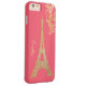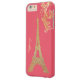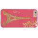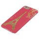 Glam iPhone 6 Plus case, with a glitzy looking gold tone glitter looking silhouette of the Eiffel Tower, against a coral pink background. Personalize the yellow gold text, for yourself or as a great gift idea.