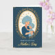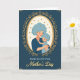 This card shows a tender scene framed inside a golden oval, where a larger guardian figure gently hugs a smaller child with their faces close and eyes softly closed ❤️. Both figures have big, light-blue curls sprinkled with tiny golden dots that glint like confetti, adding a sweet, celebratory touch. The embrace feels affectionate and secure, as the larger figure’s hands cradle the child in a calm, caring pose. An ornate border of gold scrolls and fine decorative lines wraps around the center, giving the artwork a vintage, keepsake look. Behind the frame, a deep teal background sets off the warm gold tones and makes the center glow. Small golden corner accents repeat the same curling motifs, tying the edges to the main frame. Near the bottom, a Mother’s Day message sits beneath the illustration in soft gold lettering, centered and easy to spot 🌼. The inner backdrop inside the oval is a warm creamy color, making the blue hair and gold details stand out clearly.