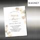 A white background decorated with golden eucalyptus sprigs. Personalize and the name of the bride to be and party details. Black and golden colored letters.
