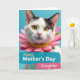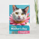 This card features a close-up portrait of a sweet house cat set against a calm blue background, creating a gentle, affectionate mood ❤️. The cat’s fur is mostly white with dark patches near the ears and forehead, and its golden-yellow eyes look straight ahead with a soft, trusting expression. Around its neck sits a wide pink collar shaped like a large flower, with rounded petals and a bright yellow center that adds a friendly, caring touch 🌼. The lighting is even and bright, bringing out the fluffy texture of the fur and the crisp edges of the floral collar. In the lower third, a teal banner with a slightly rough, painted edge carries the message “Happy Mother’s Day” in white and gold letters. Just beneath it, a narrower pink strip displays the word “Daughter,” keeping the message neatly layered and easy to read. The teal banner spans across the bottom area, with the pink strip aligned below it like a tidy label, and the cat’s flower-like collar stands out in rosy pink with a sunny yellow center.