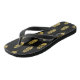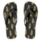 Flip flops featuring an elegant repeat pattern of glamorous gold feathers on a sleek black background. A stylish expression of individuality.