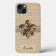 Personalized Name Gold Fleur De Lis iPhone 13 Case - Elegant cream colored damask pattern background with a chic trendy Fleur De Lis / Fleur De Lys embellishment and custom name template at the bottom.