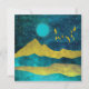 Abstract mountain landscape design in bold shades of gold, cyan,and blue with a moonrise, stars, and birds.