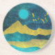 Abstract mountain landscape design in bold shades of gold, cyan,and blue with a moonrise, stars, and birds.