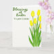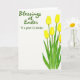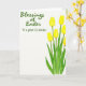 This card features a white background with a vertical spray of soft yellow spring flowers climbing up the right side, with slim green stems and long leaves that lean inward as if reaching toward someone close 🌷. The petals look lightly painted with gentle shading, giving each blossom a tender, almost see-through look. The arrangement leaves plenty of open space on the left, creating a calm pause that feels like room for a quiet note between friends. Near the upper left, a short greeting appears in flowing green lettering, angled slightly as if written by a caring hand. The green text echoes the leaves, tying the message and the flowers together without crowding the page. The yellow blooms add a sunny warmth that feels like a friendly nudge and a soft smile, with a little springtime charm 🐇. Along the right edge, the tallest flower sits near the top while smaller blooms and buds trail below, all painted in pale gold with muted green accents.