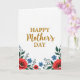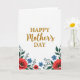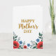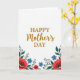 This card features a bright white background with the words “HAPPY Mother’s DAY” centered and easy to read, setting a loving tone ❤️. “HAPPY” sits above “Mother’s,” and “DAY” appears below, all in a warm golden-brown color that feels cozy and affectionate. The top and bottom words use a classic serif style, while “Mother’s” is written in a flowing cursive look that adds a gentle, caring touch. In the lower left and lower right corners, matching flower clusters lean inward as if they’re reaching toward the message like a hug. Each corner includes large scarlet-red blossoms with dark centers, paired with smaller sky-blue flowers that have sunny yellow middles 🌼. Deep green leaves weave around the stems, and little blue berry-like dots tuck between the foliage for extra texture. The open white space around the center keeps the golden-brown lettering crisp, while the corner florals frame it like a soft border. The red flowers and blue blossoms sit low in both corners, with green leaves and tiny blue berries curling upward along the edges.