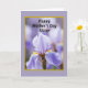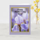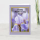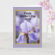 The front design shows a large iris-like flower centered in the frame, its petals curling softly in layers of lavender and gentle purple that feel as tender as a sisterly hug ❤️. Fine vein lines and smooth folds give the petals a silky look, while the flower’s core glows with sunny yellow and deep purple accents that pull your gaze inward. Behind it, the background fades into a soft blur of violet tones, like a quiet garden moment shared between close friends. Near the top, the text reads “Happy Mother’s Day Sister” in black, slanted lettering that sits lightly over the floral scene. A thin golden-yellow border frames the image, adding a warm edge like a sunbeam around the bloom 🌼. Outside that border, a wider field of pale lavender surrounds everything, keeping the focus calm and centered. The lighting stays diffused and gentle, with no harsh shadows, so the petals look softly illuminated. The golden-yellow frame sits neatly within the pale lavender outer area, with the flower centered and the black message aligned above it.