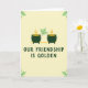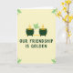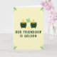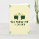This greeting card features two sturdy dark green cauldrons set side by side on a thin golden line, like a matched pair leaning close in quiet companionship 💚. From each pot, golden bubbly plumes rise and curl upward, meeting the eye with the kind of glow that suggests shared inside jokes and steady support. The background is a soft creamy yellow, keeping the scene light while letting the greens and golds stand out. Below the illustration, the message “OUR FRIENDSHIP IS GOLDEN” sits centered in dark green lettering, tying the warm gold above to the bond between the two cauldrons. In the corners and near the top, stylized green maple leaves float as a gentle frame, adding a calm, nature-inspired touch ☘️. The symmetry of the cauldrons and the way their golden streams lift together gives the scene a tender, together-forever feeling without showing any faces. Small leaf shapes hover above the central area, and the gold accents stay concentrated around the cauldrons and the baseline.