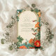 A striking wedding design framed by a golden vintage border and adorned with a lush cascade of summer florals in shades of red, orange, and peach. Inspired by classic botanical illustrations and ornate 19th-century styling, this piece blends elegance and natural vibrance—perfect for a garden or outdoor celebration with timeless flair.